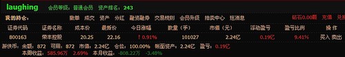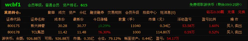 我的股票 代码简称成本/现价涨幅数量市值盈亏 800178TCL集团9.81/10.58 1.73% 45000 0.48亿7.90%