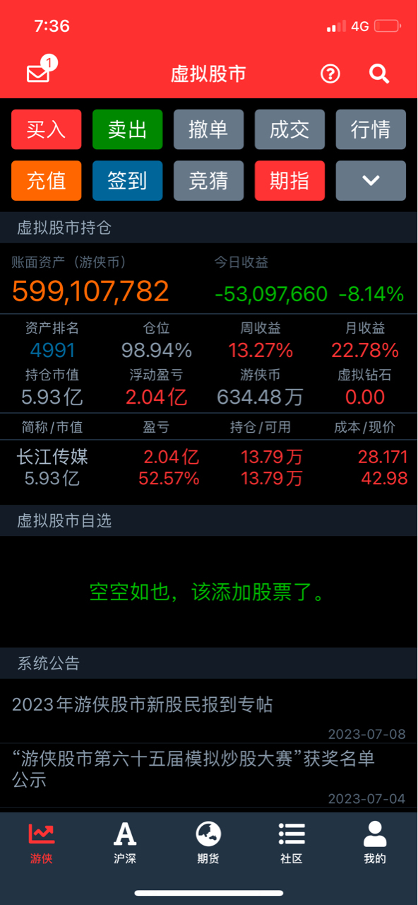 2023年4月19日祝贺(实盘)焦点科技再次二连板涨停,要套现的股东,卖给系统也是一笔收益啊,关联功能启用后,虚拟股票关联的A股实盘股票每涨1%,系统账户将增加 ...