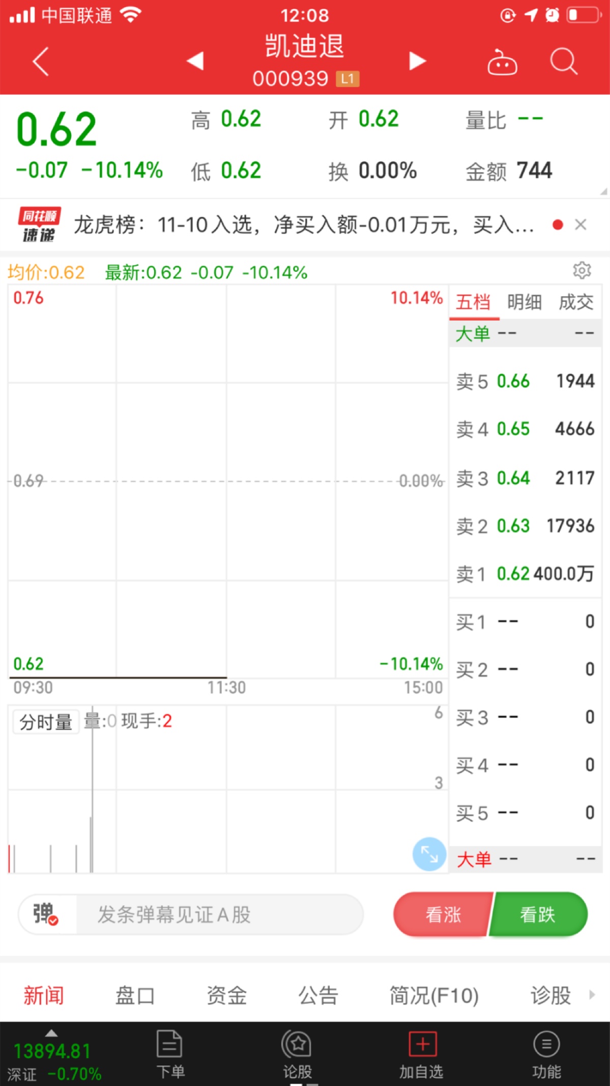 凯迪生态今天进入退市整理期,今日早盘,直到9点32分才成交了一笔交易,成交也只有一手,耗资62元,估计买入的这位也只是买来留作纪念吧。截止午间收盘,凯迪退 ...