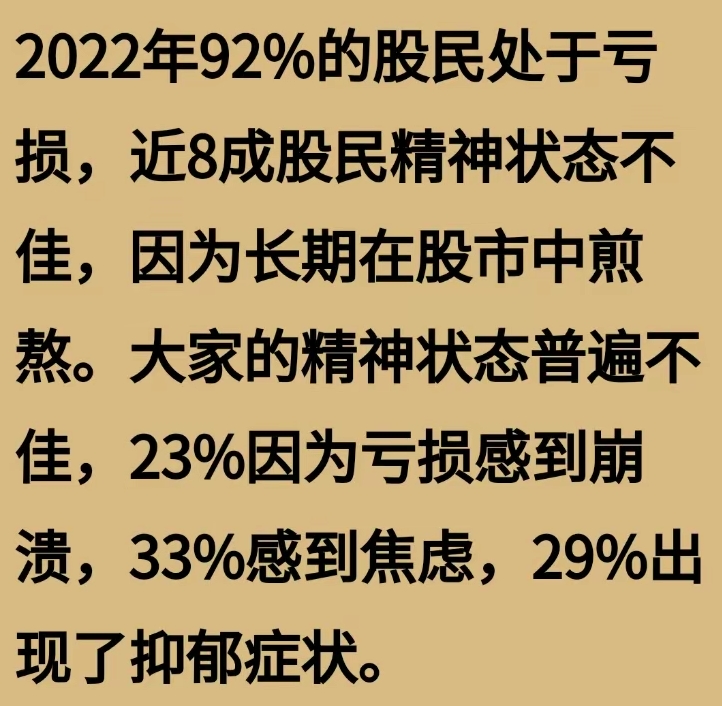 2022年92%股民亏损,人均亏损7.6万,超8成股民精神状态异常2月2日,央视财经频道播出了《经济半小时》,并对2022年的股民投资情况进行了调查。超92%股民亏损,超 ...