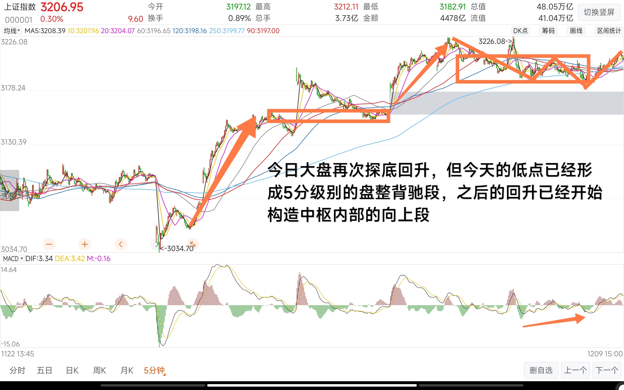 今日大盘再次探底回升,放量回踩半年线,最终小阳线收于5日均线上方。目前5分钟图上涨趋势形成,今天的低点构造第二个中枢内部的盘整背驰段,尾盘的回升可以看成 ...