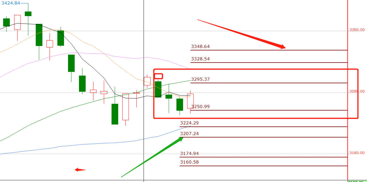 从分型结构看,如果明天冲高到3288到3295区间容易出现回调或者震荡整理,向下3250到3260区间是一个5分钟走势的背离位置这里会有反抗,向上和向下的压力和支撑, ...