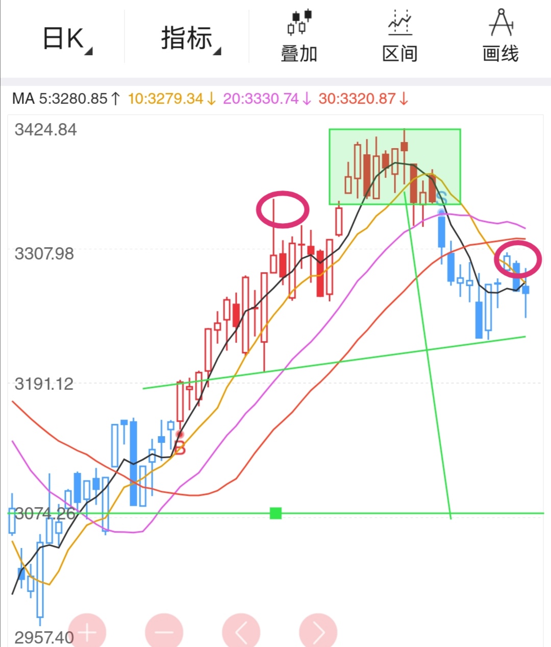 短期应有收盘价在3228以下点位出现。3150点既是本轮上涨的半分位附近,又是上涨时的阻力位。本次回踩到该点位,测试支撑强度。