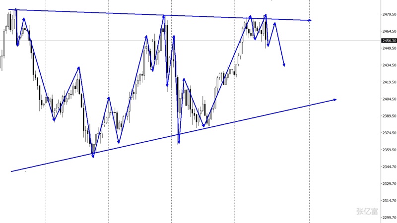 /盎司,后行情先拉升给出2472.9美元/盎司,给出2455.4美元/盎司,日线最高触及到了2479.9美元/盎司,后行情在美盘开始受到