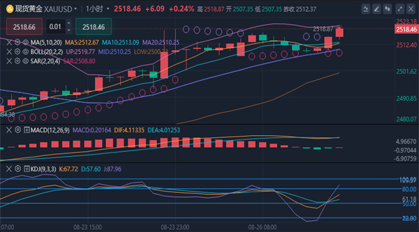 黄金消息面分析】:周五(8月23日),现货金上涨1.2%,至每盎司2,512.63