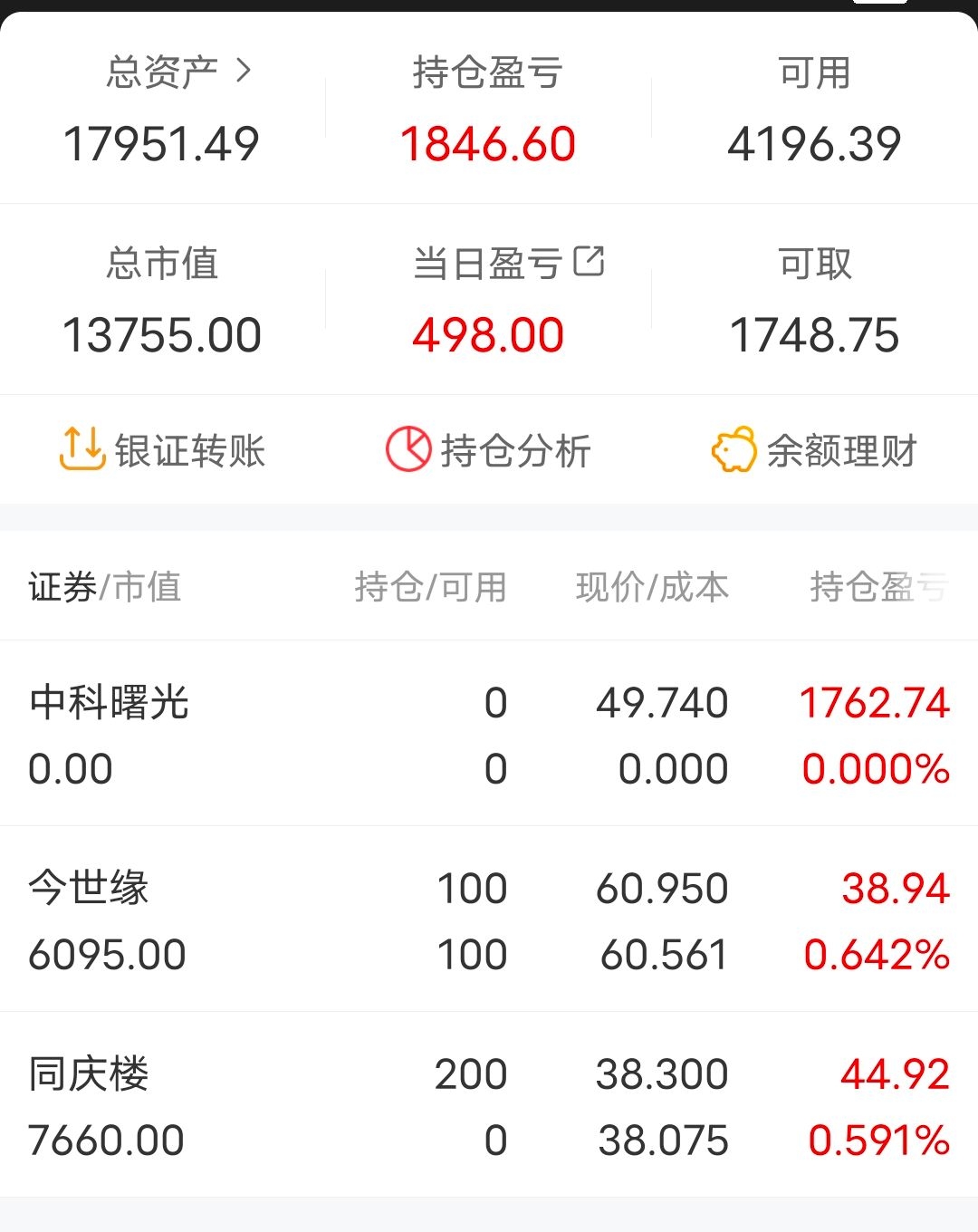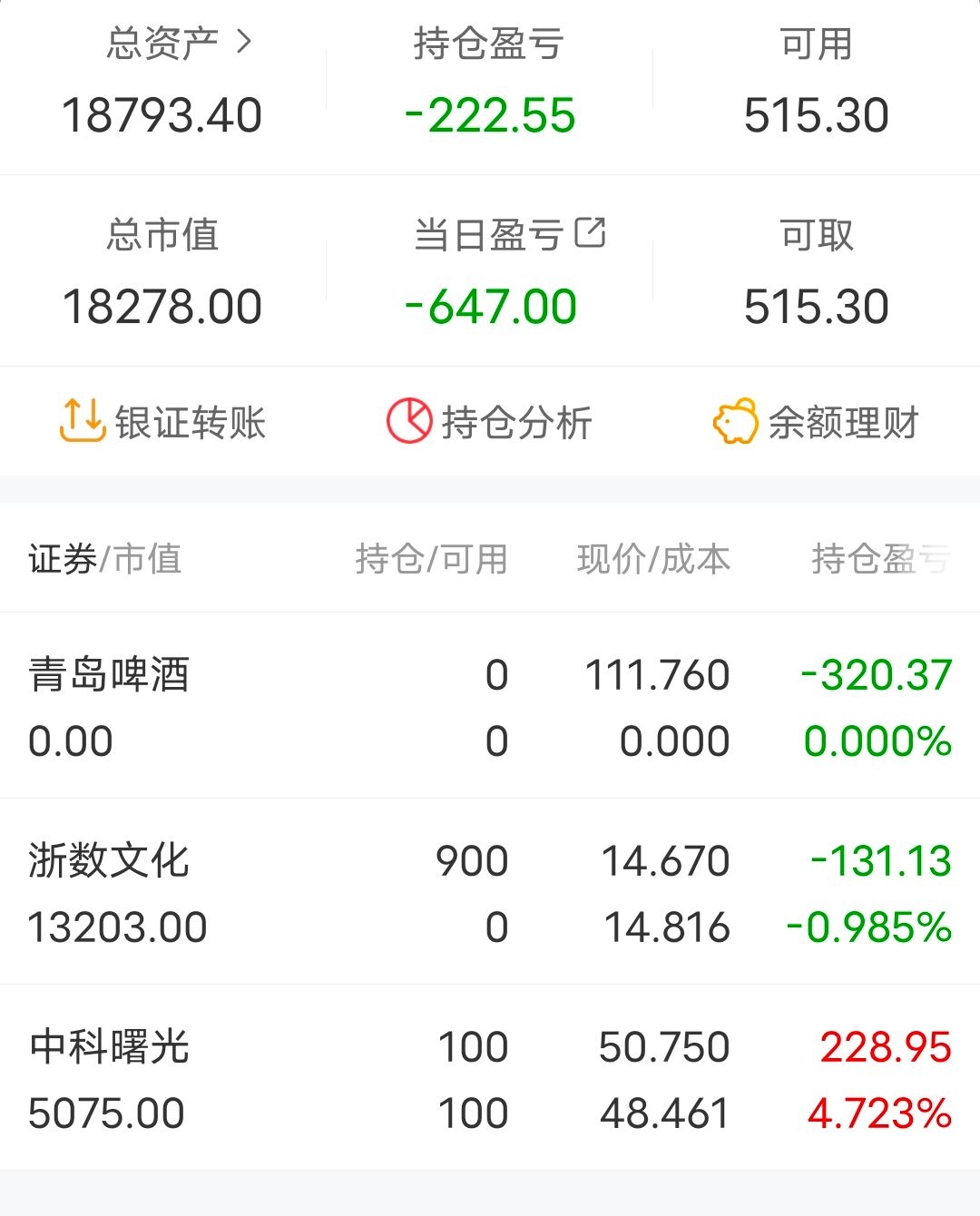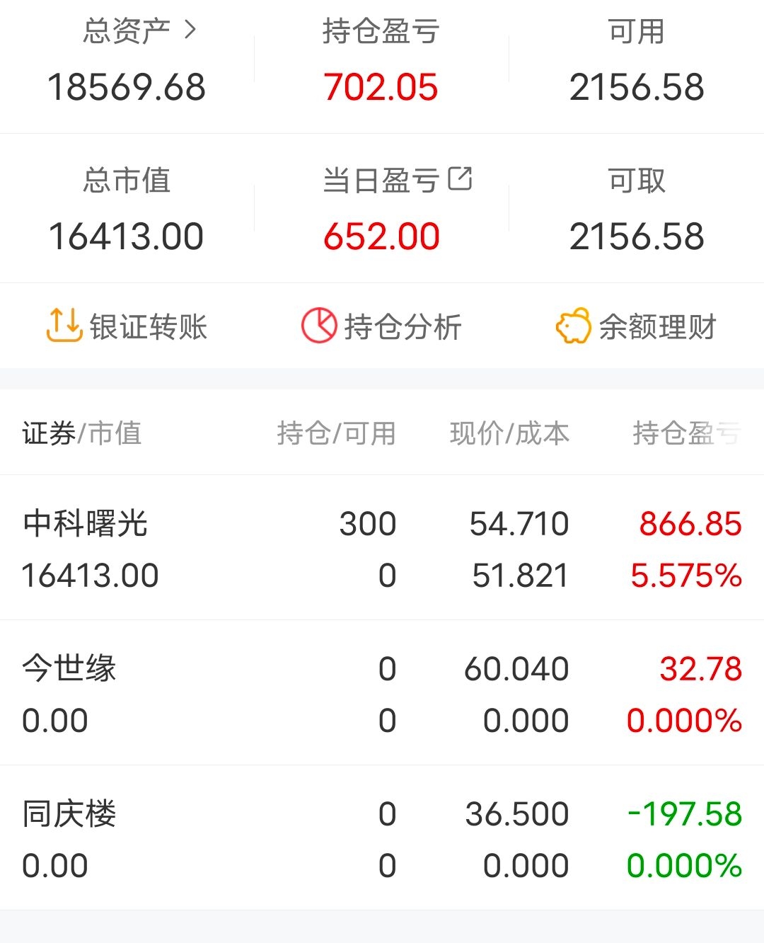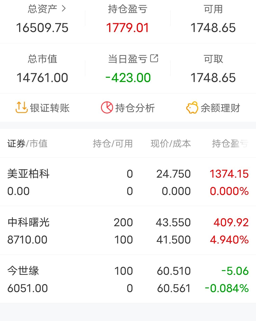 4月17日,学生党日常分享第九贴。周末美亚柏科一纸减持公告让我闻到了一股不妙的气息,心想还好周五觉得鸡蛋全放在美亚风险太大减仓了一半。果然,由于我上课又不能时时盯盘,一看今天上午股价已经打下去了10个点。尾盘没有任何起色,最后集合竞价前卖了。管理层自己才是最了解公司情况的,自己都觉得股价已经高估了那我还也没必要留着了,况且确实从ps来看股价也不低了。或许它还能涨,不过我不会去吃逻辑之外的东西了。中科曙光下午由于消息面拉升了两个点左右。尾盘集合竞价上了今世缘,肯定有朋友说今天很像诱多,拉高后持续低走,但是我觉得看茅台业绩,白酒不像是某位说的已经快萧条了的样子。每年如果能保持20%左右的增长率,不得不说是个绝对厉害的企业,就如当年的云南白药。今世缘如果能保持20%的增长率,那么接近30倍的pe我觉得是合理的价格。