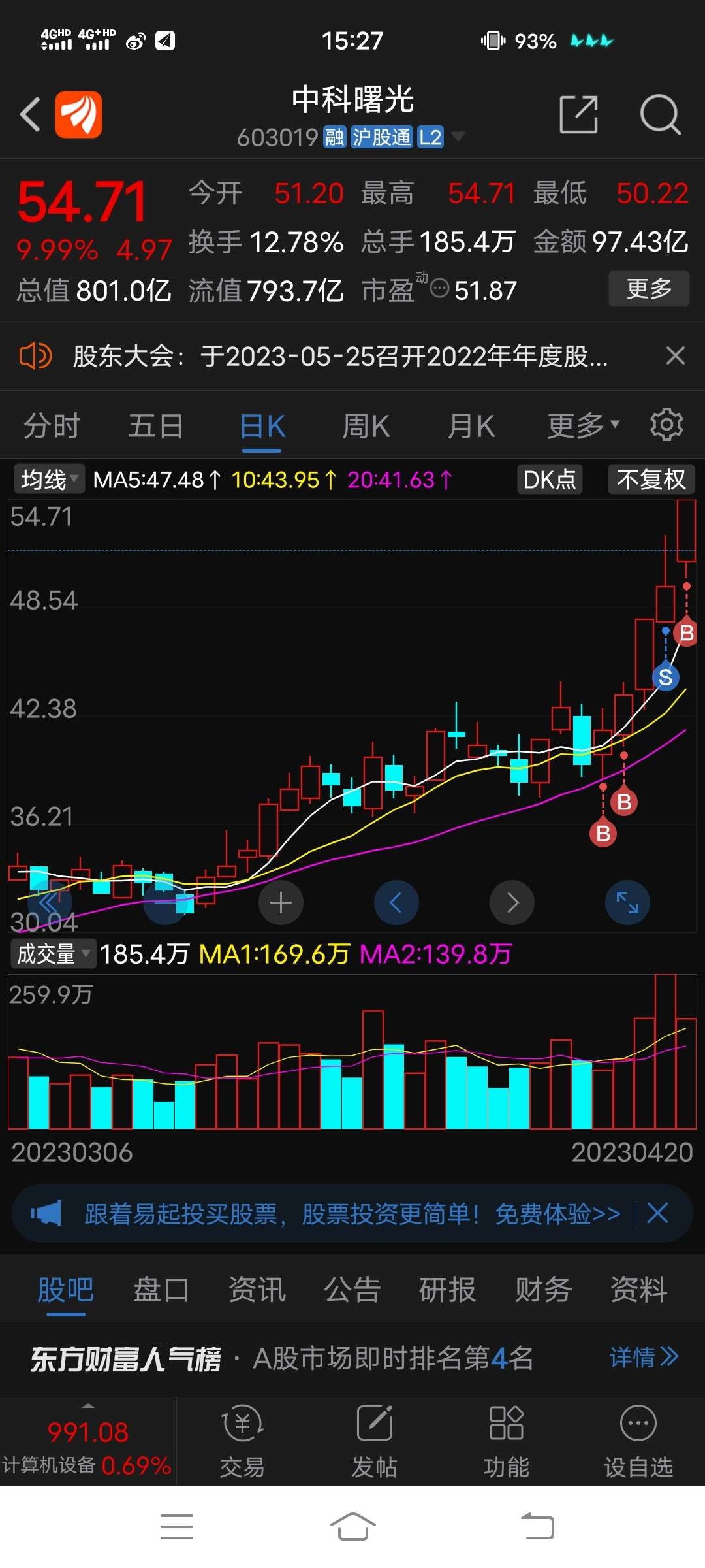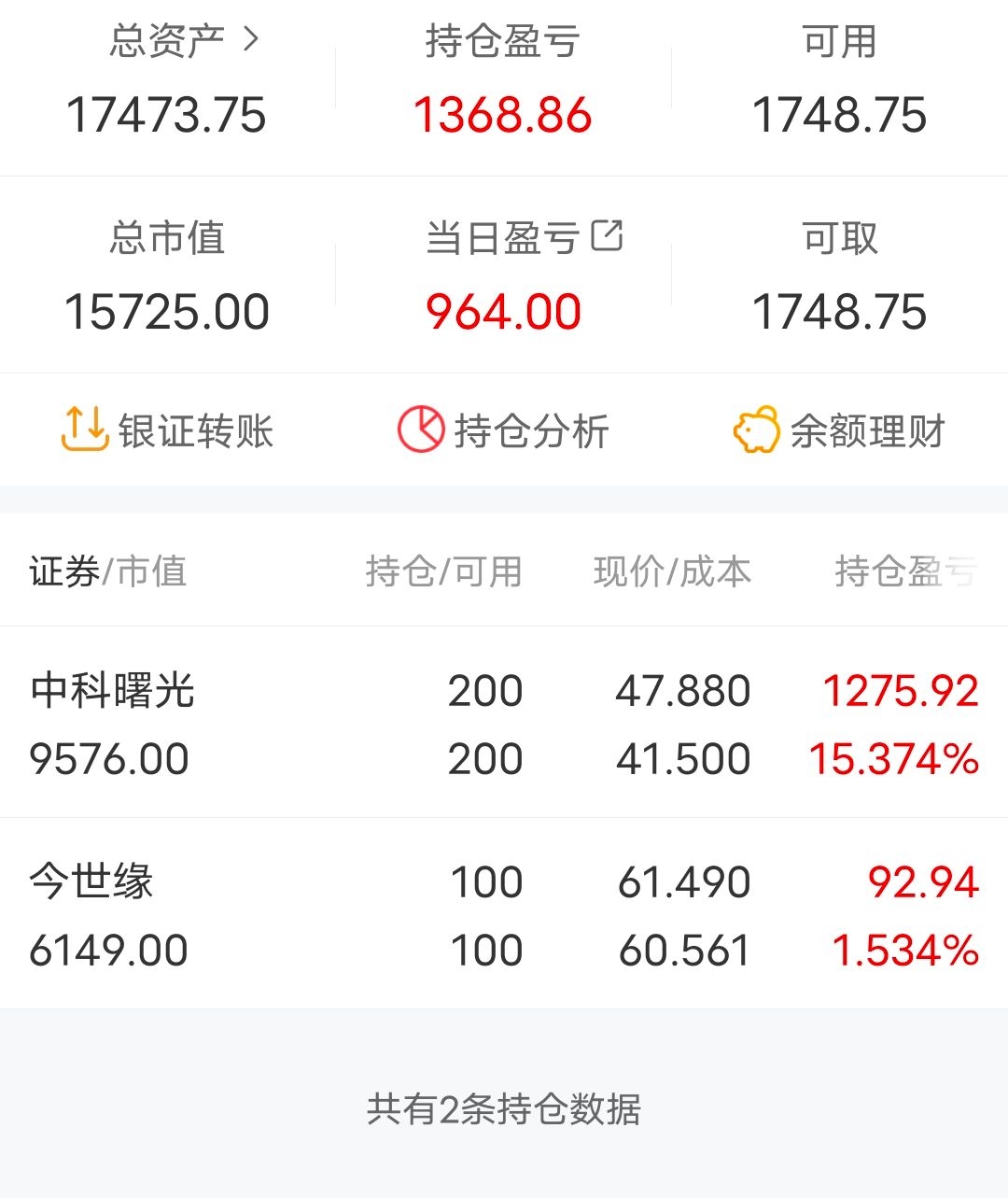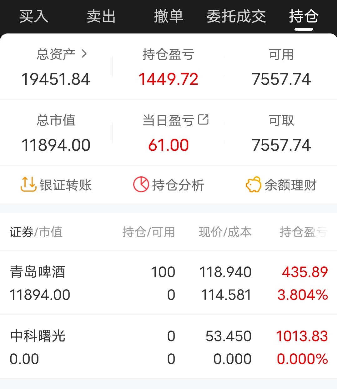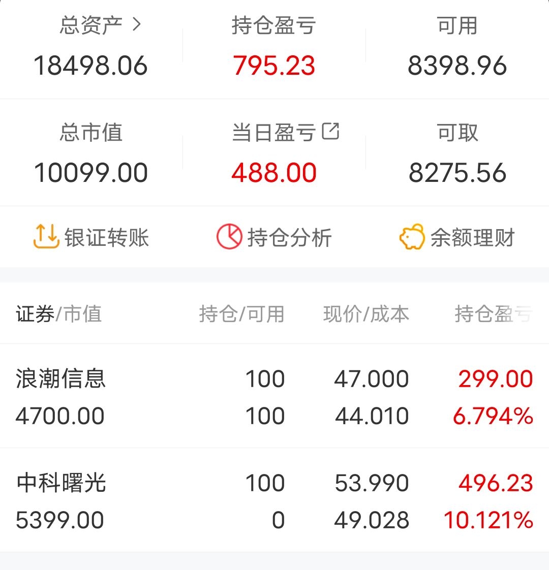 4月17日,学生党日常分享第九贴。周末美亚柏科一纸减持公告让我闻到了一股不妙的气息,心想还好周五觉得鸡蛋全放在美亚风险太大减仓了一半。果然,由于我上课又不能时时盯盘,一看今天上午股价已经打下去了10个点。尾盘没有任何起色,最后集合竞价前卖了。管理层自己才是最了解公司情况的,自己都觉得股价已经高估了那我还也没必要留着了,况且确实从ps来看股价也不低了。或许它还能涨,不过我不会去吃逻辑之外的东西了。中科曙光下午由于消息面拉升了两个点左右。尾盘集合竞价上了今世缘,肯定有朋友说今天很像诱多,拉高后持续低走,但是我觉得看茅台业绩,白酒不像是某位说的已经快萧条了的样子。每年如果能保持20%左右的增长率,不得不说是个绝对厉害的企业,就如当年的云南白药。今世缘如果能保持20%的增长率,那么接近30倍的pe我觉得是合理的价格。