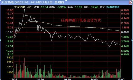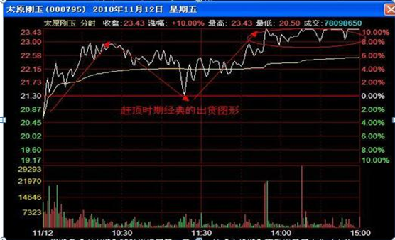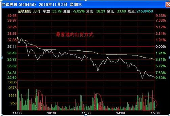 此种出货手法,常出现在股价大幅上涨后的末期。盘中表现为,主力快速拉高股价,中间没有任何停顿,分时走势陡峭,涨幅超过7%,然后主力抛出一个大卖单,将下方跟风追涨的买盘一网打尽。盘中经常会有跳水,第二日个股通常以低开低走的形势套住前面追涨的