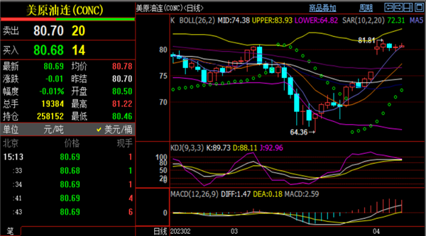 短线多空持续性不强。本周周初依旧重点关注上轨81.80-82.60之间的突破,突破才能打开进一步的上涨空间,否则仍要谨防回马枪。4小时图目前暂时维稳在79.0-81.70窄幅震荡,刚好是布林道的收缩区间上下轨,上周在区间内来回拉锯。目前还不好判定突破延续,短线在79.0上方暂时震荡偏多。小时图也是收口震荡当中,周初依旧先在区间内看震荡,突破再调整思路。综合来看,原油今日操作思路上刘铭诚建议回调低多为主,反弹高空为辅,上方短期关注81.5-82.7-83.8一线阻力,下方短期关注79.6-78.7一线支撑。