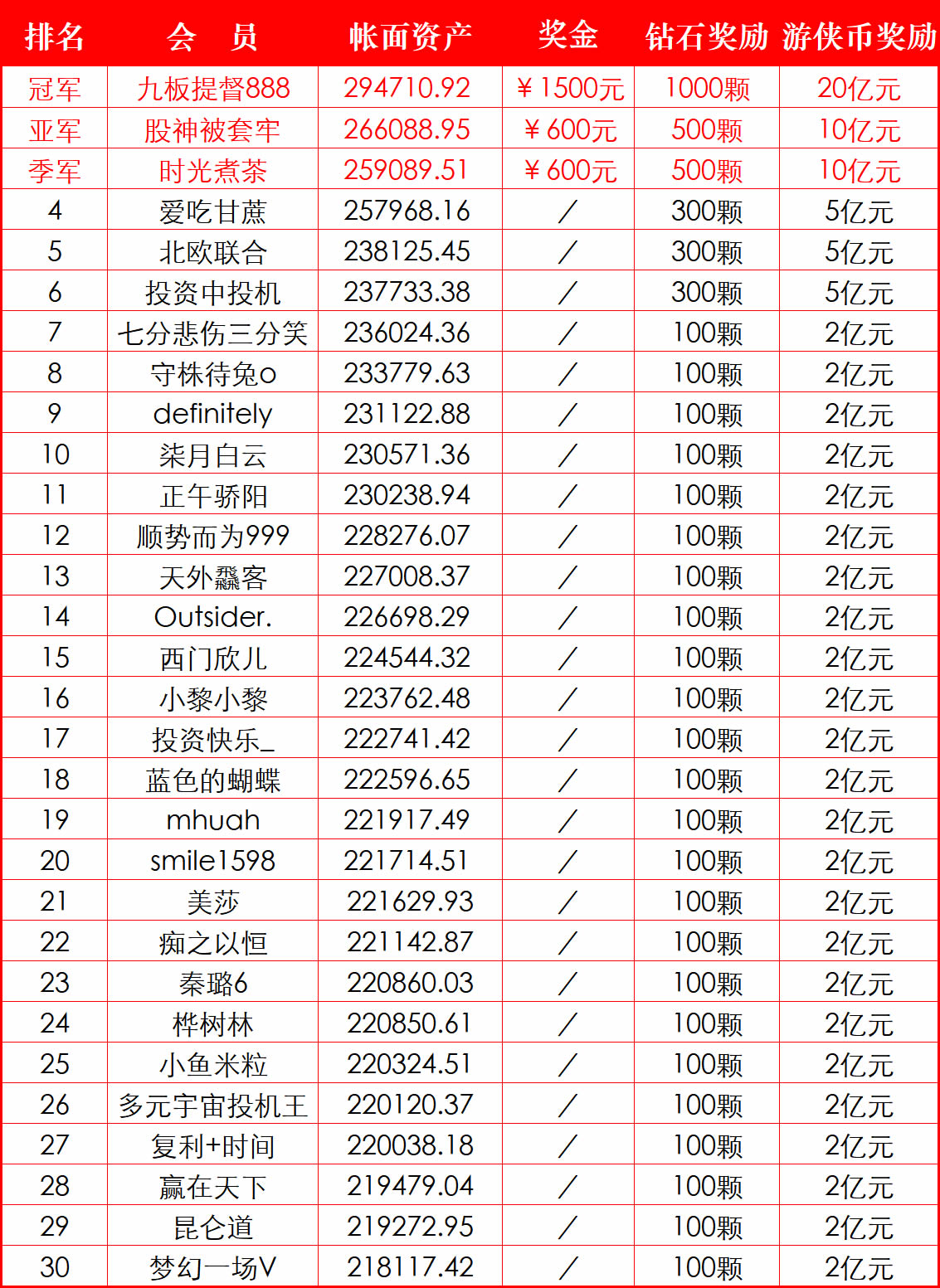 “游侠股市第六十七届模拟炒股大赛”自2023年8月28日开始,至2023年10月27日结束,恭喜 @九板提督888 以47.36%的总成绩成为本届大赛的冠军,奖金¥1500元,并可获赠虚拟钻石1000颗及游侠币20亿元!本届大赛的获奖名单如下: