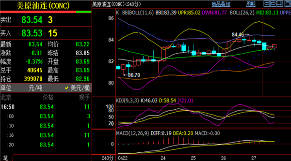 (美原油(美原油06,94.35,1.43%,模拟交易)05,102.76,1.18%,模拟交易)继续维持小区间震荡整理,日内低点82.9,高点83.4,交投空间有限。技术面来看,短线震荡区间严重压缩,上方阻力看1小时图形MA30均线粘合SAR指标压力位83.7位置,4小时布林带上轨阻力在84.3一线,日线中轨粘合日线SAR指标压制在84.5,对于今日