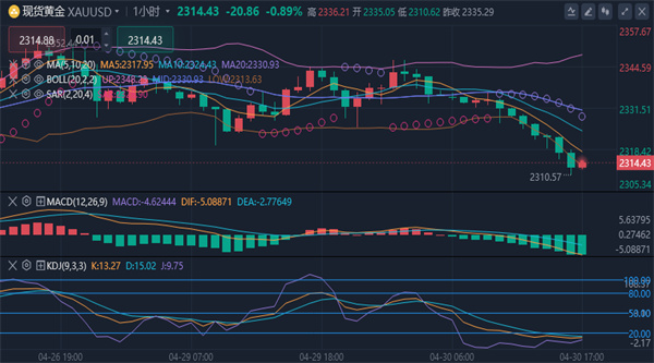 【黄金技术面分析】:今日阻力关注4小时布林带中轨与MA5