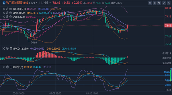 【原油技术面分析】:4小时布林带中轨粘合4小时MA5均线位于78.9一线,4小时MA60均线粘合SAR指标延伸点位于79.4一线,更上方参考80-80.5区域做为防守阻力范围。支撑方面留意4小时布林带下轨77.3和上周低点76.8形成的支撑区域,若下破则会加速下行,更下方支撑依次参考76-75-74整数关注对待。整体来看原油价