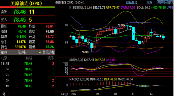 (美原油(美原油06,93.50,0.52%,模拟交易)05,102.16,0.59%,模拟交易)白盘波动很小,目前小时线布林带收口,先关注1小时布林带上下轨79.5-78.7区间的破位情况再定后续方向。技术面上4小时布林带上轨在80.2,下轨处于77.8一线,打破这个温和区间才会迎来加速行情,没破之前围绕此区间高沽低渣交投即可。向上偏差看80.5阻力位,向下偏差看上周低点76.8支撑点。