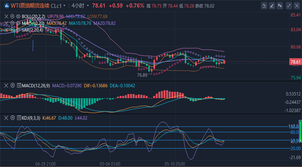 【原油技术面分析】:原油日线来看,上周三下探76.8附近后迅速拉升,日线收了一根下影线较长的锤子线,走出了止跌回升的信号,但是始终没有突破80关口,周五逼近80关口后一度下跌1.72%,不过周一并没有延续上周五的跌势,而是反弹站上79关口,目前来看油价大概率会站上80关口。四小时线来看,周一油价在77.7一线开始走反弹,最终站上79关口,目前布林带收口,油价处于中轨之间,KDJ金叉后向上发散运行,MACD也形成金叉,能量柱翻红,整体走势比较强。目前原油需求情绪乐观,而且欧佩克+减产也对其产生支撑,油价上周在76.8附近获得支撑后上行,目前暂时受阻于80关口的阻力,但是在经过蓄力后应该能够冲上80关口并站稳,所以目前还是以看多为主。原油白盘阻力看78.9-79.3两个节点,支撑看昨日低点77.6一线,日内暂定79.2-77.7区域高抛低吸建仓,向上破位79.3阻力看80.2-80.5区域,若向下破位支撑看77和76关口,整体思路维持高空不变。
