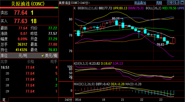 (美原油(美原油06,93.71,0.74%,模拟交易)05,102.36,0.79%,模拟交易)低开低走,日内低点触及76.8止跌反弹,目前实时现报价77.3一线。目前技术面上原油小时线图形SAR指标出现在底部,配合16时收阳