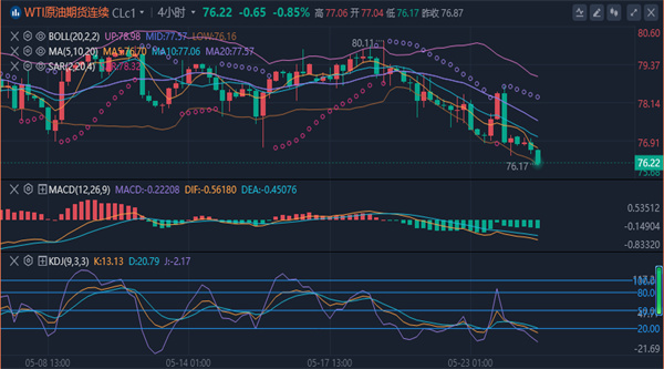 期货日线来看,周一冲高80关口后回落,目前已经连续下跌四个交易日,目前已经跌破了76.7附近的强支撑,在没有利好出来之前预计还将继续下跌,下方支撑看至75.5附近。四小时线来看,周一冲高80关口后就一直走震荡回落,周四从77下方一度反弹至78.66美元/桶后最终回吐涨幅并且跌破76.7的强支撑,目前布林带三轨开口向下运行,油价处于中下轨之间,KDJ死叉后向下运行,MACD死叉后向下运行,整体走势偏空运行。综合来看,原油在80关口遇阻回落,目前已经跌破了此前76.7一线的强支撑,目前还没有止跌的迹象,预计在6月1日欧佩克+会议之前油价很难有太大起色。今日原油策略:反弹77.2-77.7分批做空,止损78.2,目标76.0-75.5.