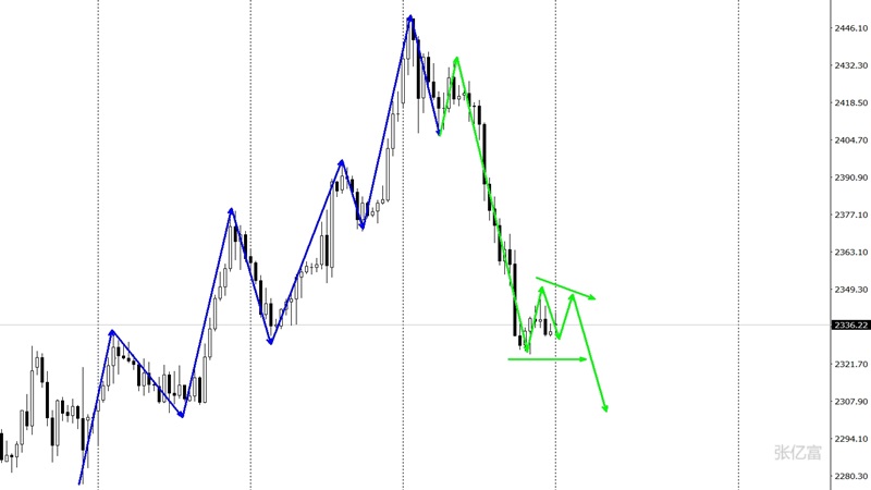 运行了一个下跌加速走势,当前根据形态上可以看出五浪雏形,上方多空分水岭在2352一带,反弹遇阻后将出现继续承压走势,下方强弱分界线在2308水平。综合以上分析,张亿富认为:黄金空头趋势中,今日黄金有望延续,操作上考虑反弹做空为主,低多为辅,上方关注2347-2352美元阻力,下方关注2310-2305美元支撑。