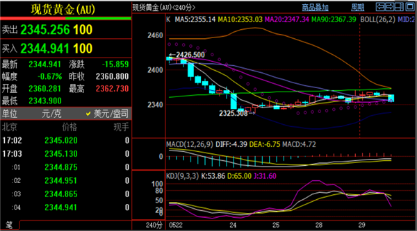 (美黄金06,4721.4,0.46%,模拟交易)白盘价格从1小时线上轨跌到1小时线下轨,实时线报价2350一线。盘面上直观支撑就是看1小时MA60