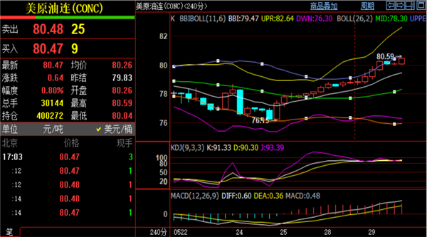 (美原油(美原油06,93.68,0.71%,模拟交易)05,102.07,0.50%,模拟交易)白盘慢涨破位近4周高点,实时现报价80.4一线。昨夜美盘79.4做空,凌晨80.2挂空单持仓中,这两个原油空单的止损取消,晚间防守82关口继续看跌。没破就拿稳向下看78.5和77两个目标点位,下破76则波段成立,若是破位则严格止损离场。今日阻力方面关注4小时布林带上轨与误差带上轨粘合压力点80.9一线,日线MA60均线重合周线MA5均线压制点在81.6位置,若向上破位则确认转变为上涨趋势,上方关注斐波那契工具23.6位置82.8一线。