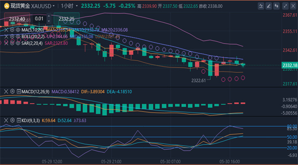 【黄金技术面分析】:黄金4小时级别来看,价格在承压前面大阴线顶部2363附近回落,布林带走平,连续几日的反弹都无法突破2365一线的中轴位置,说明行情还是偏弱,只有突破2365-2375区域才能结束这种弱势整理结构,否则