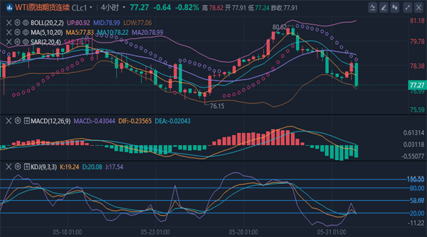 (美原油(美原油06,93.75,0.78%,模拟交易)05,102.21,0.64%,模拟交易)技术面分析】:原油上周五下探回升收高,周内连跌四日,上涨一日,惯性下探后之后继续回升区间之内,收回77.0上方,局部继续围绕低点之下拉锯震荡,三次下探回升。继续稳固了低点区域的支撑,本周76.10-76.60低点依旧是关键。三次测低回升,是构造底部回升还是蓄势破低走弱,留意低点与颈线间的争夺,决定后市方向。4小时图再次的大阳线探底回升,与此前76.80 76.68 双低点形成三针探底之迹象。尾盘原油重点关注周五美盘反弹高点78.5以及四小时MA120