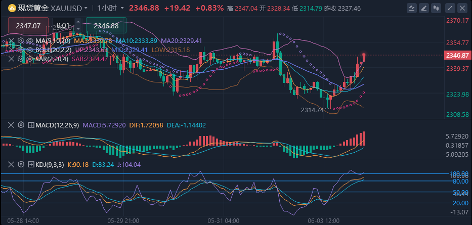 美元下方承压,日内最低触及2314美元水平,日内波动幅度在15美元左右。尽管五月份金价
