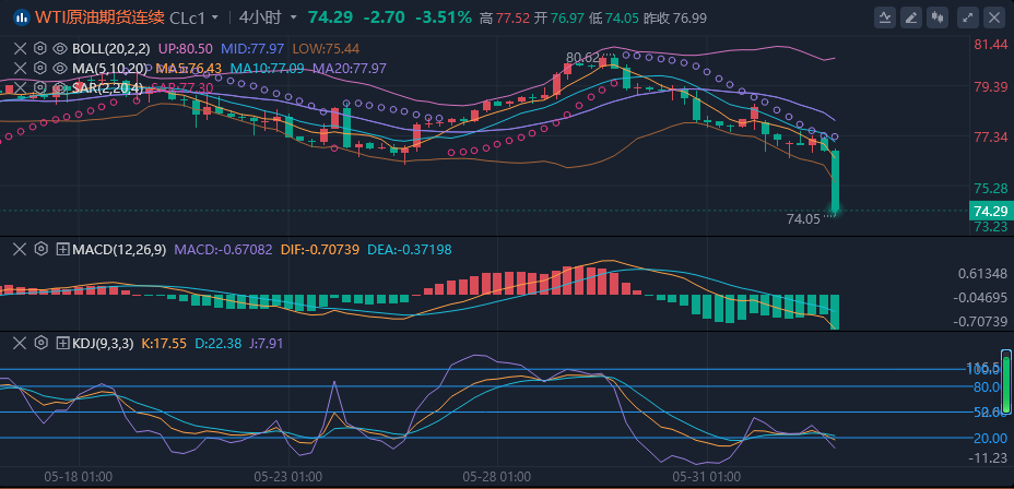 美原油小幅下探,一度刷新逾一周低点至76.39美元/桶,但仍坚守在5月24日创下的近三个低点76.16美元/桶上方,由石油输出国组织(OPEC)和以俄罗斯为首的盟国组成的OPEC+产油国集团周日同意将大部分深度减产措施延长至2025年,给