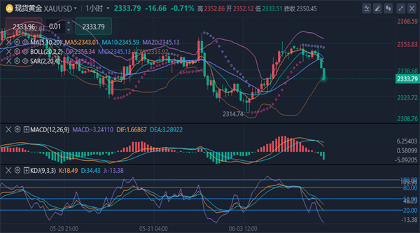 (沪金2606,1040.76,2.03%,模拟交易)跌破2340美元/盎司,较前一交易日下跌14美元。技术分析显示,黄金技术面发出看空信号,空头目标指向2318.50美元/盎司。