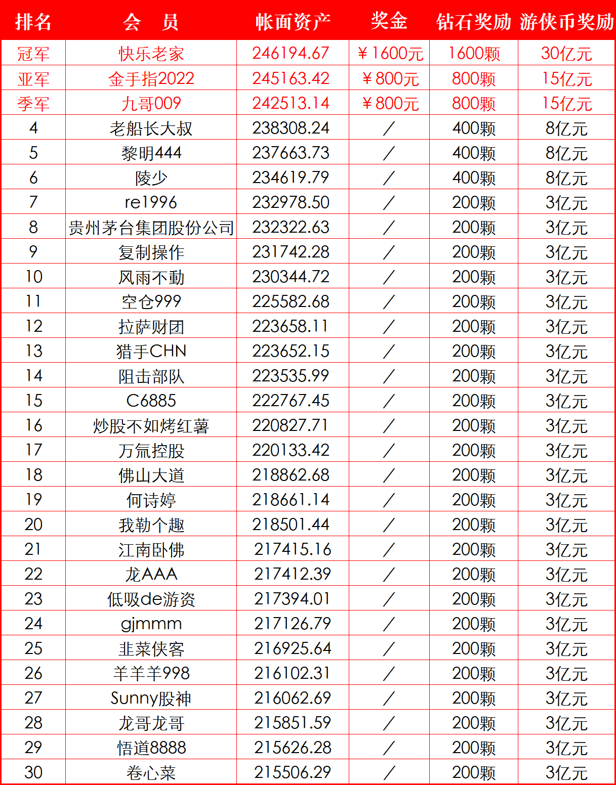“游侠股市第七十一届模拟炒股大赛”自2024年4月22日开始,至2024年6月14日结束,恭喜 @快乐老家 以23.10%的总成绩成为本届大赛的冠军,奖金¥1600元,并可获赠虚拟钻石1600颗及游侠币30亿元!本届大赛的获奖名单如下:
