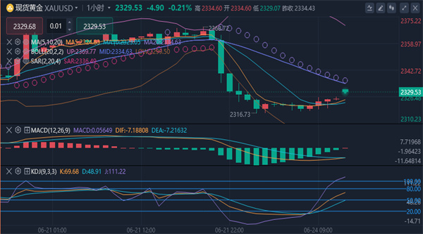 (美黄金06,4703.7,0.09%,模拟交易)震荡微跌,目前交投于2330.89