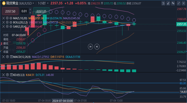 K线经过一波横盘整理后向上突破,价格在前高2368附近形成双顶形态,但价格并没有太多回调,均线呈多头排列,指标金叉,说明当前行情处于强势之中,