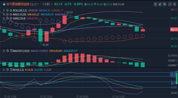 【原油技术面分析】:原油高位盘整实时现报价83.2一线,技术面来看1小时布林带逐渐收口,白盘暂定小时线上轨84和下轨81区间内震荡盘整,更大的行情波动预计只会在周五大非农公布后才会出现。今日思路很简单,防守84.5一线做空。阻力关注小时线上轨83.8和昨日高点84.3形成的压制区域,支撑方面留意1小时布林带下轨81支撑,后面破位可能性比较大,建议大家依次留意80整数关口。整体来看原油价