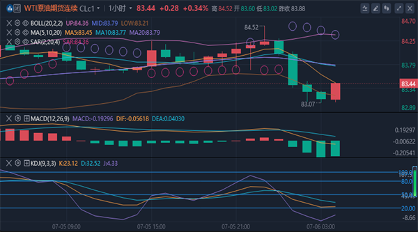 均线多头排列,MACD金叉良好运行,布林带开口,多头仍占据明显上风,之前尽管受到4月26日高点84.5附近阻力压制,但油价回调力度较小,都没有跌破82.6的5,10日均线支撑,从而再次出现反弹,多头测试高点,暗示后市仍有计划继续震荡走高,如果顶破84.5附近位置,则有望进一步试探4月19日高点86.26附近位置阻力。综合来看,原油下周操作思路上建议以回踩低多为主,反弹高空为辅,上方短期关注84.5-85.0一线阻力,下方短期关注82.2-81.7一线支撑。