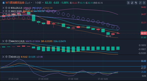 油价自6月5日以来处于单边上涨走势,短期均线多头排列,MACD金叉良好运行,布林带开口,多头仍占据明显上风,之前尽管受到4月26日高点84.5附近阻力压制,但油价