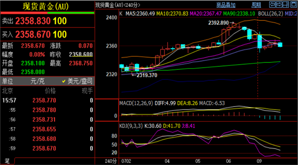 金价格开盘慢涨,日内高点触及2369一线转弱下行,实时现报价2358一线。