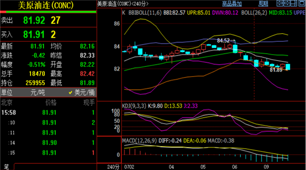 K线正处于8连阴阶段,实时现报价82关口,向下破位的几率极大。技术面来看原油白盘的反弹幅度只有4个点,触及82.4就快速回落,刘铭诚看好行情跌破昨日低点82关口就会加速下行。4小时附图指标上MACD快慢线死叉,绿色能量柱持续放量,KDJ随机指标同步死叉下探,破低看来已经成为定局。