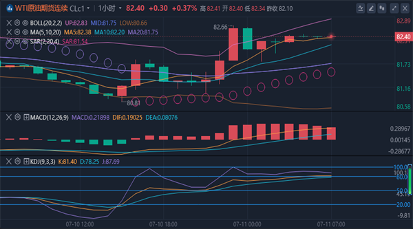 (原油2605,693.9,-6.31%,模拟交易)自6月5日以来处于单边上涨走势,短期均线多头排列,MACD金叉良好运行,布林带开口,多头仍占据明显上风,之前尽管受到4月26日高点84.5附近阻力压制,但油价回调力度较小,都没有跌破82.6的5,10日均线支撑,从而再次出现反弹,多头测试高点,暗示后市仍有计划继续震荡走高,如果顶破84.5附近位置,则有望进一步试探4月19日高点86.26附近位置阻力。综合来看,原油今日操作思路上建议以回踩低多为主,反弹高空为辅,上方短期关注82.8-83.3一线阻力,下方短期关注81.0-80.5一线支撑。