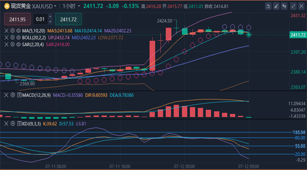 美元企稳上移,在2385区域承压徘徊,美盘时段上涨加速,最高点触及2413美元遇阻调整。黄金日线级别,在小阳线收盘后,出现了大阳线拉升,触及前期阻力位一带,多头表现很强劲。四小时级别上看,黄金