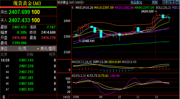 (美黄金06,4699.6,3.51%,模拟交易)周初跌周尾涨这个思路完全正确,昨夜高点更是触及2424一线,后续也是快速回落修复指标,实时现报价2404一线,技术面来看4小时附图指标MACD红色量能柱减弱,KDJ随机指标高位结死叉,对于今天的黄