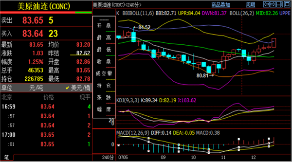(美原油(美原油06,93.02,-5.03%,模拟交易)05,101.56,-3.29%,模拟交易)周五刷新高点,实时现报价83.5一线。技术面来看4小时附图指标MACD红色量能柱放量,快慢线金叉上探,KDJ随机指标金叉,但是接近超买区域,