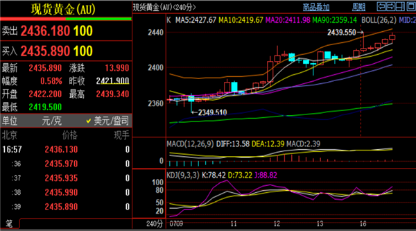黄金实时行情分析:周二黄金早盘触及2420一线止跌反弹,实时现报价2435一线。目前来看黄金短线周期价格明显偏向看涨,但是也逐步接近历年高点2449位置,向上的每一小步都存在很强的压力,交投建仓要保持理智,切记不可在高位追多。技术面来看4小时附图指标上MACD红色量能柱放量,KDJ随机指标金叉上探,加上