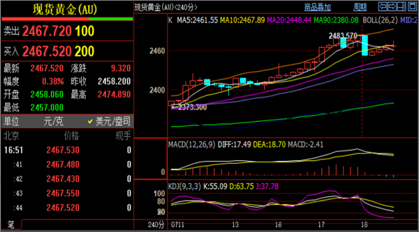金价格低点触及2451止跌反弹,实时现报价2471一线,这波修复指标行情基本上算是走完了,欧美盘观察反弹力度再去布局空单。技术面来看4小时附图指标MACD快慢线高位粘合,绿色量能柱持续放量,但KDJ随机指标接近超卖区域,运行情况正好相反,这就需要市场情绪催发才会走出明显方向,刘铭诚个人还是偏高位做空,毕竟只有下跌才会出现出乎意料之外的暴跌行情。