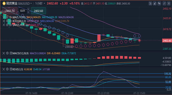 (美黄金06,4697.4,3.46%,模拟交易)强势反弹,最高曾触及2412美元/盎司,不过目前