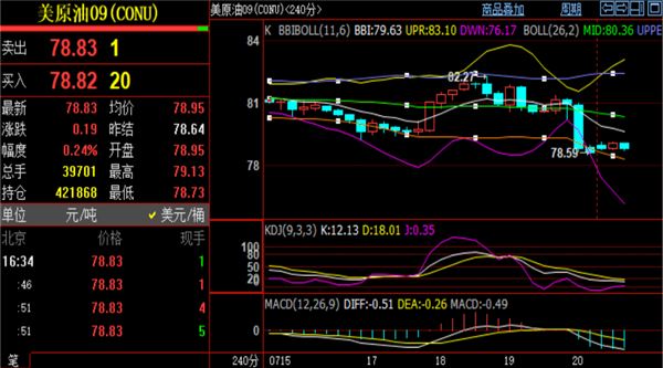 (美无铅汽油05,3.1852,-3.39%,模拟交易)刘铭诚还是延续看空,激进者可以参考79-79.2区域做空看78.3-77.5。技术面上4小时附图指标MACD绿色能量柱持续放量,快慢线死叉良好,KDJ随机指标接近超卖区域,配合4小时布林带三轨与各周期均线同步下移,短时间内难以改变下行趋势,顺势看空即可。