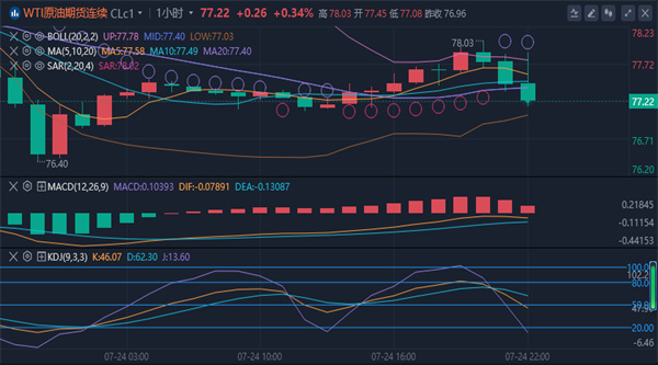 美国原油库存大幅下降。这一上涨走势是在几天的价格下行压力之后出现的,为交易员提供了一个潜在的转折点。北京时间18:05,WTI原油盘中报77.53美元每桶,涨幅0.74%。