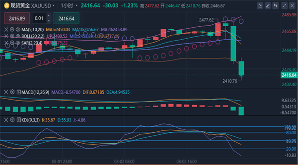 金价格突破周内高点2468到达2477后无力上行,截止发文金价