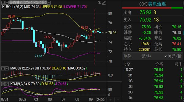 油价格稳定慢涨,使得4小时布林带上轨从昨日76.5位置上移来到77.2一线,短期走势有望先向上发展触及阻力范围。技术面来看1小时布林带上下轨区间收口,上轨76.5,下轨75.5,这算是日内的温和震荡区间,后续行情破位再看延续即可。4小时附图指标上MACD快慢线金叉,但红色量能柱开始减弱,KDJ随机指标超买区域拐头向下发散,RSI相对强弱指标超买区域结死叉向下运行,同时1小时SAR抛物线指标信号出现在1小时上轨附近,日内若是触及76.5附近可以轻仓做空。