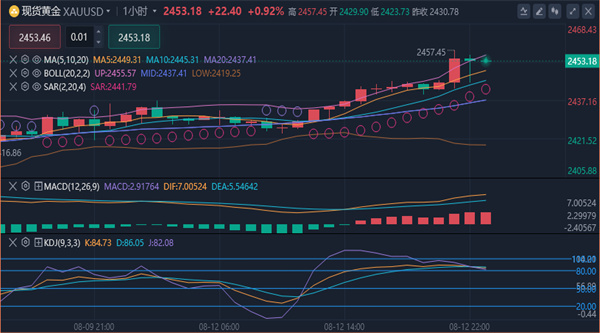 短线出现高位滞涨格局,小时图连续冲高试探高点,最终也未能形成强势上涨,视为横盘修正,而这种修正,还是多头趋势的中继修正,短线主思路,仍然主多。黄金目前围绕以2400-2410为支撑,2465-2470为压制的高位区间波动为主。综合来看,今日黄金短线操作思路上回调做多为主,反弹做空为辅,上方短期重点关注2465-2470一线阻力,下方短期重点关注2438-2433一线支撑。
