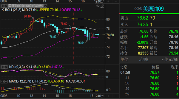 (美原油(美原油06,93.55,-4.49%,模拟交易)05,101.40,-3.44%,模拟交易)期货,预计会先行下跌寻找底部支撑范围。明日开盘就看周线MACD给出的量能信号是处于缩量阶段还是放量阶段就能判断出大方向,上方阻力暂定78-79.2-80.1,下方支撑看75.5-74.5-73,刘铭诚个人偏向反弹做空建仓,临盘策略等开盘后再做更新。